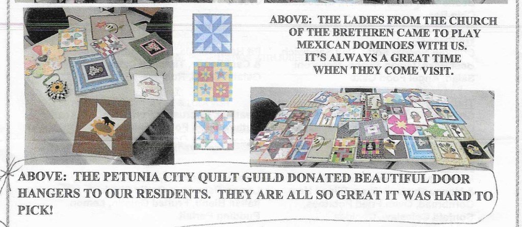 Guild President, Carolyn, shared the Heritage Square Retirement Center newsletter that included this picture of the door hangers recently donated to them by members of Petunia City Quilt Guild as the 2022 charity project;