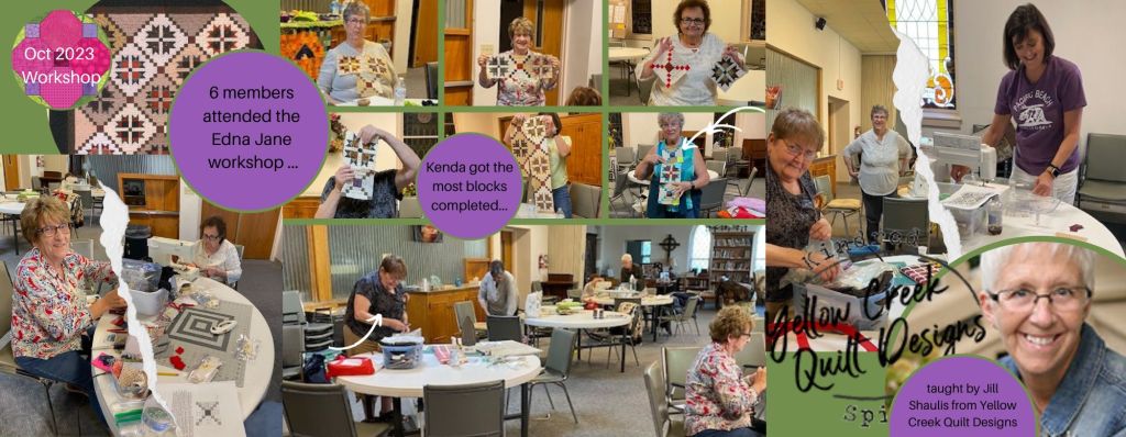 Six members were able to attend the Edna Jane workshop held October 2, 2023 led by Jill Shaulis from Yellow Creek Quilt Designs. It was fun to see the variety of quilt fabrics chosen by each member. Jill shared some great hints, in particular, one related to squaring up hourglass blocks that are 1 7/8″!! This hint will be very useful in the future!!