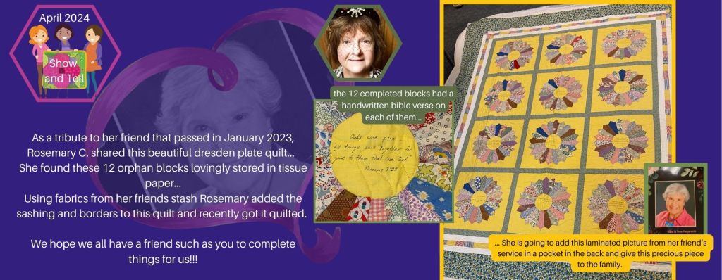 This beautiful Dresden Plate finish by Rosemary C. was a precious tribute to her friend who passed in January of 2023. The care taken to preserve these blocks is commendable!