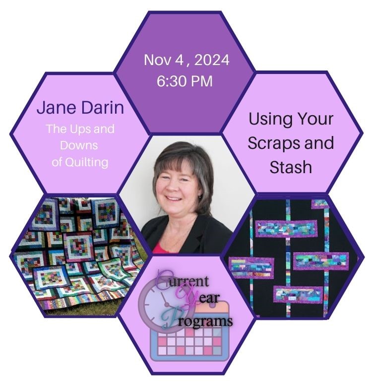 The November program has been changed to a presentation by Jane Darin, from The Ups and Downs of Quilting. She will present a lecture on Using Your Scraps and Stash as part of the regular meeting November 4, 2024 at 6:30 p.m.