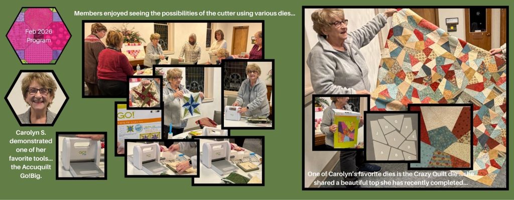 Member Carolyn S. shared her favorite quilting tool with Members at the February meeting. Her love of using the Go! Big accuquilt cutters and dies showed as she shared the technique used to cut fabrics with the dies. She also had several samples of projects that could be made with the tools. It was a very inspiring and interesting program.