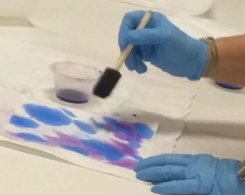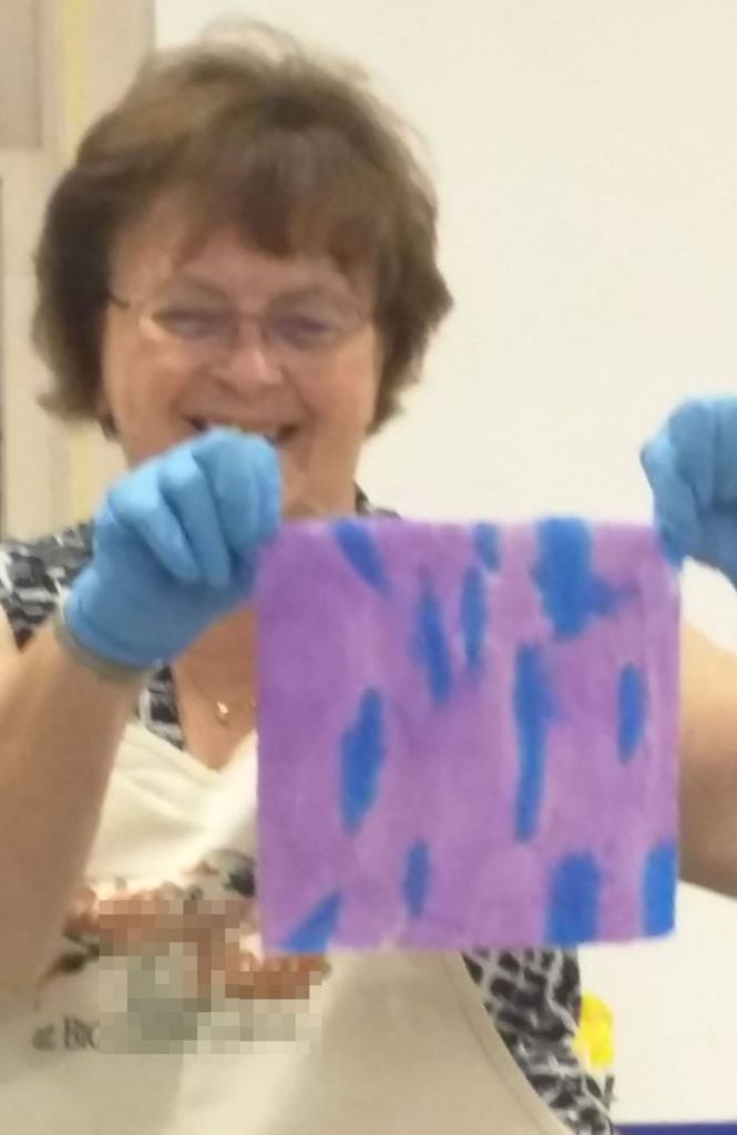 Diana showed us with small pieces of fabrics various ways to use just a sponge brush and some Dy-Na-Flo paints to make lovely fabrics with an unending range of patterns, ideas, and colors!
