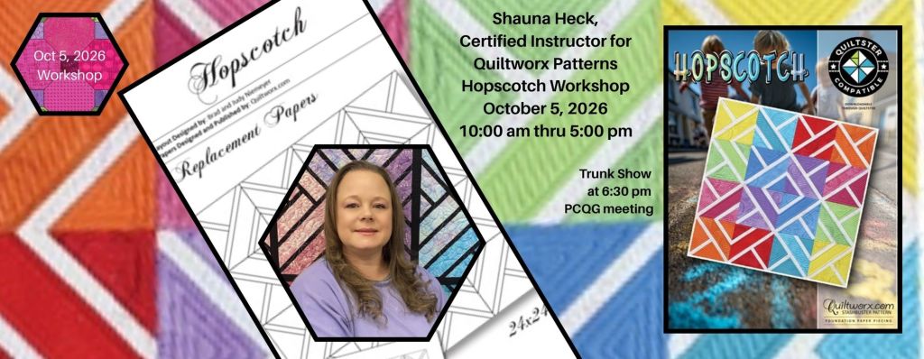 Monday, October 5, 2026 at 10:00 A.M. – 5:00 P.M: Quiltworx Hopscotch Pattern taught by Shauna Heck, Certified Quiltworx Instructor. Supply list and class fee information will be supplied soon.