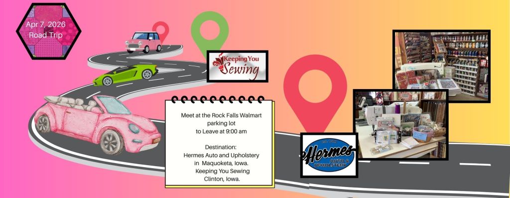 Tuesday, April 7, 2026 at 9:00 A.M.: Join members on a Road Trip to Hermes Auto and Upholstery in Maquoketa, Iowa. There will also be a stop at Keeping You Sewing in Clinton, Iowa. Meet in the Rock Falls Walmart parking lot to leave by 9:00 AM to start the journey.